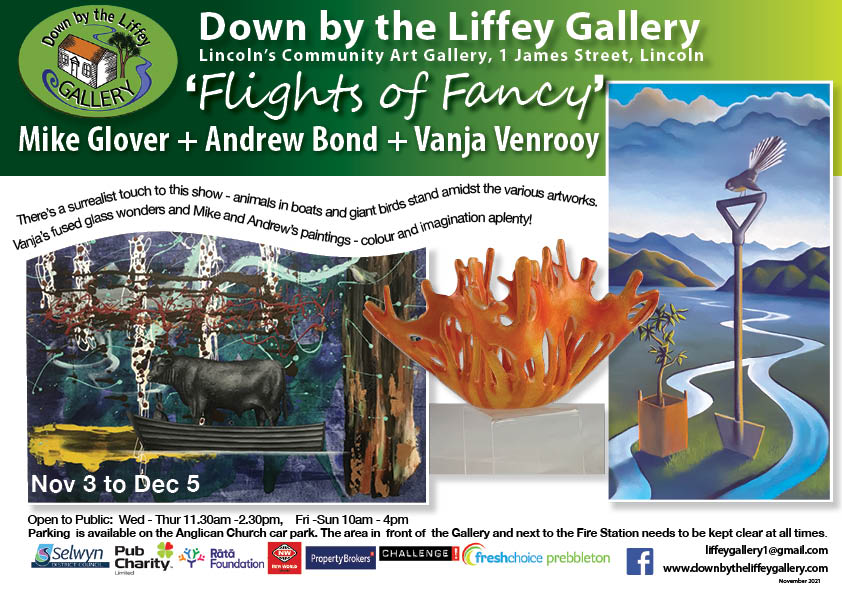 ‘Flights of Fancy’ November 1, 2021November 1, 2021 downbytheliffeygallery Uncategorized Mike Glover Andrew Bond Vanja Venrooy There’s a surrealist touch to this show – animals in boats and giant birds stand amidst the various artworks. Vanja’s fused glass wonders and Mike and Andrew’s paintings – colour and imagination aplenty!