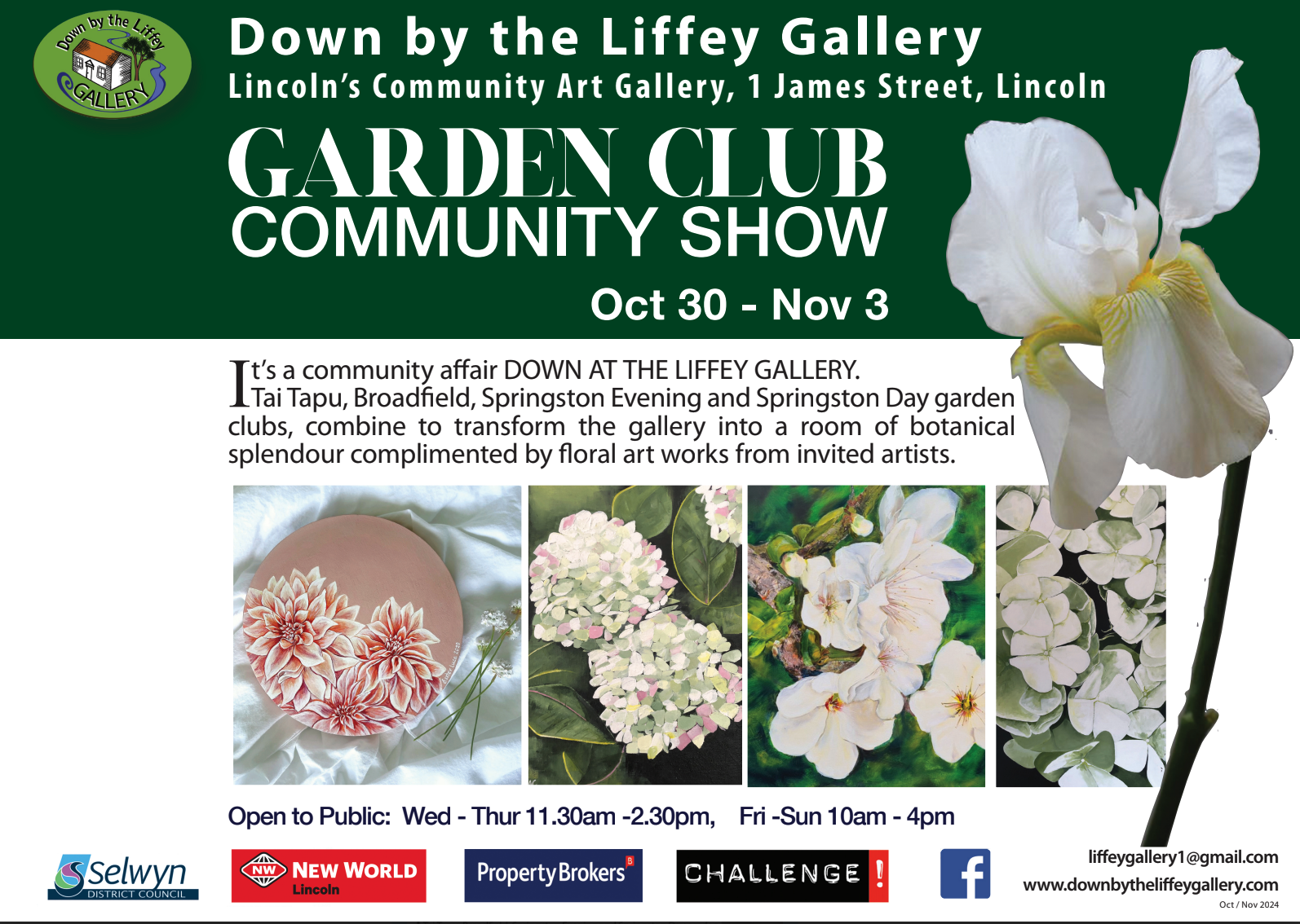 It’s a community affair down at the Liffey Gallery. Tai Tapu, Broadfield, Springston Evening and Springston Day garden clubs combine to transform the gallery into a room of botanical splendour complimented by floral art works from invited artists.