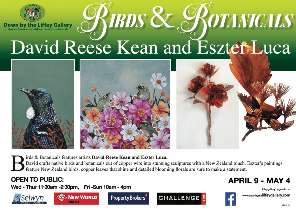Birds & Botanicals features artists David Reese Kean and Eszter Luca. David crafts native birds and botanicals out of copper wire into stunning sculptures with a New Zealand touch. Eszter’s paintings feature New Zealand birds, copper leaves that shine and detailed blooming florals that are sure to make a statement.
