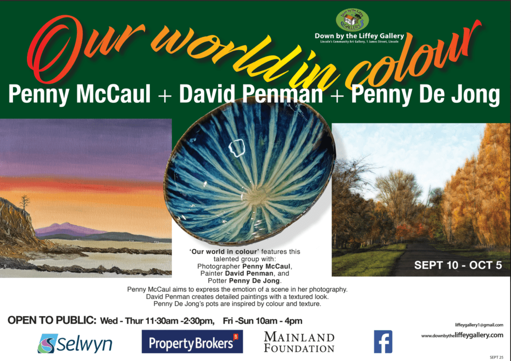 ‘Our world in colour’ features this talented group with: Photographer Penny McCaul, Painter David Penman and Potter Penny De Jong. Penny McCaul aims to express the emotion of a scene in her photography. David Penman creates detailed paintings with a textured look. Penny De Jong’s pots are inspired by colour and texture.